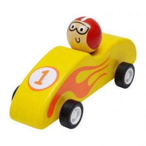 Hátra húzzuk a versenyzőt és már száguldhat is a versenyző! Kapható még zöld színben is! Ajánlott korosztály: 3-5 éves korig Alapanyag: fa Méret: 6,6 x 5 x 5 cm
