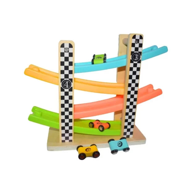 Fából készült állatos autópálya 4 darab kisautóval. Ezzel a játékkal garantált a szórakozás kicsiknek és nagyoknak egyaránt. Az izgalmas és mókás kikapcsolódást főként a gravitáció hatásai nyújtják, mivel a lejtőn a kisautók ennek köszönhetően gurulnak le egyik pályáról a másikra. Játék közben fejlődik a gyermekek szem-kéz koordinációja, vizuális követés képessége, képzelőereje és kíváncsisága, amely elengedhetetlen ebben a korban.