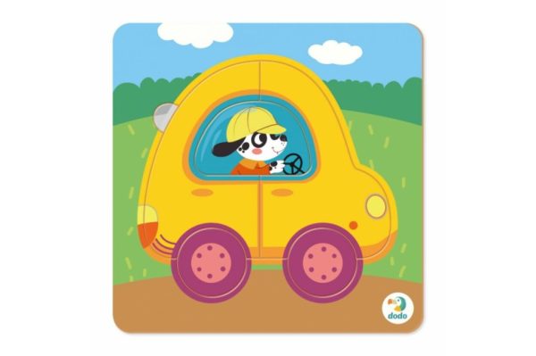 Üdvözöllek a varázslatos DODO világában! A Dodo 5 db-os Keretes Baby puzzle – Autó című képen egy sárga kisautót és sofőrjét, a kiskutyust láthatjuk kirakást követően.