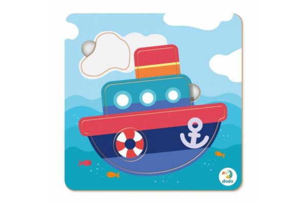 Üdvözöllek a varázslatos DODO világában! A Dodo 5 db-os Keretes Baby puzzle – Hajó című képen egy szép kék hajót láthatunk vasmacskával és úszógumival.