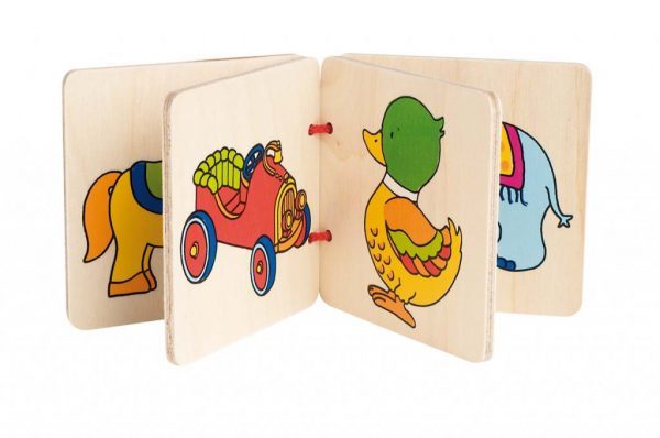 Ebben a fából készült könyvben 8 színes kép látható, melyek gazdag témát nyújtanak a szókincs fejlesztésre, a színek és formák ismeretének rögzítésére. A falapokat zsinór fűzi össze, ez adja a könyv jelleget.