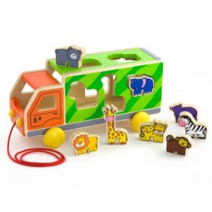 A játék formabedobóként és húzható autóként is használható. A színes fa állatokkal külön is lehet játszani, akár rövid mesék is eljátszhatók segítségükkel. Ajánlott korosztály: 2-4 éves korig Alapanyag: fa Méret: 27,5 x 11,5 x 13,5 cm
