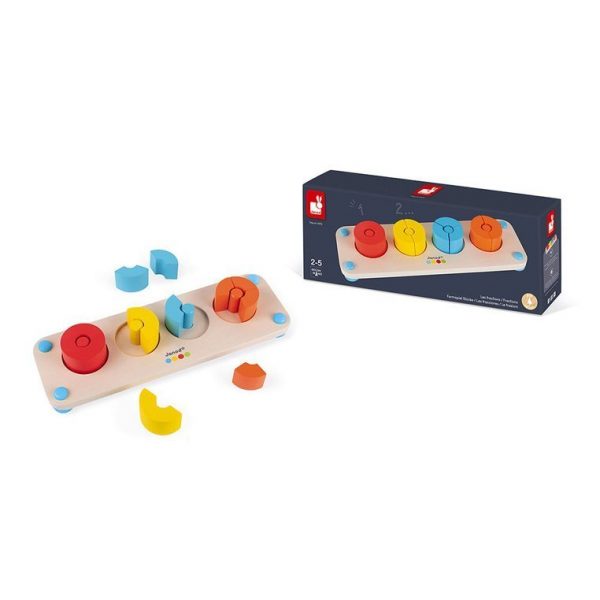 A JANOD francia márka Essentiel sorozatának fából készült puzzle termékei tökéletes bevezetés az osztás és az összeadás megtanulásához. Segít sok kulcsfontosságú képesség fejlesztésében egy gyermekben, beleértve számolás, összeadás, megkülönböztetés a színekben, a koncentráció, az érzékelés és a türelem. A készlet 4 kerek lyukú állványt tartalmaz, amelyben a rudak körül intenzív színű karikákat kell elhelyezni – a piros perem egy darabból áll, a sárga két részből áll, a kék háromból és a narancssárga – négy. A karikák elrendezése lehetővé teszi a gyermek számára, hogy a matematikai kérdéseket egyszerűen és olvashatóan magyarázza.