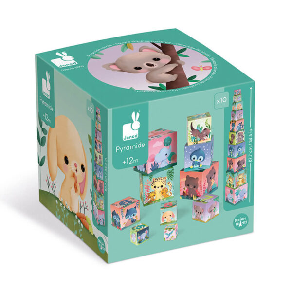 Piramis torony A francia Janod márkától .10 darab négyzet alakú építő kockából áll, amelyek a legjobb minőségű kartonból készülnek. Tökéletes játék egy éves gyermek számára, aki szereti az építkezést. A kockák könnyűek és biztonságosak, megfelelően különböző méretűek, így egymásra rakhatók, és játék után – egymásba rakhatók, a megfelelő sorrendben. Az oldalukon gyönyörű, színes képek vannak az ultra aranyos kis állatokról (pl. medve, nyuszi, gepárd, pingniv) . A kockák felső oldalán 1-től 10-ig terjedő számok találhatók, így az idősebb gyermekek is használhatják őket a számolás megtanulásához, sőt, dobozokként a kiegészítő rajzokhoz is.