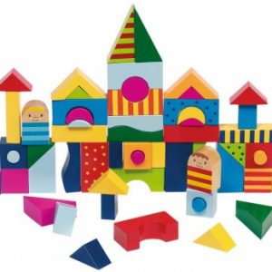 Kisváros, torony és még számos épület felépíthető ezekből a színes elemekből. 57 db építőelem. 23,5x23,5 cm, anyaga: fa