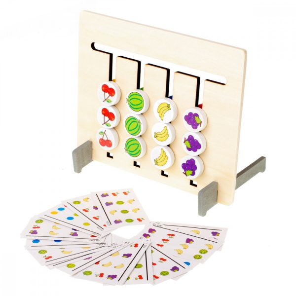 Nagyszerű logikai játék fából, mely fejleszti a gyermekek logikus gondolkodását, memóriájukat, szín és forma világukat. Lényege, hogy a gyümölcsöket, vagy a színeket kombináljuk a segédkártyákon bemutatott minták szerint.