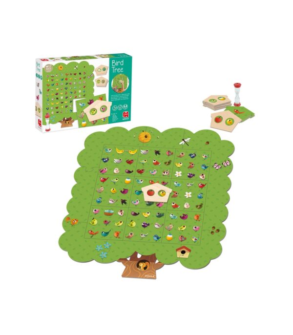 Találd meg a kártyán lévő madarakat a faház segítségével még mielőtt kifutsz az időből! Párosító játékként is használható. Szín és formafelismerést fejlesztő társasjáték 1-4 játékos részére, 3 éves kortól. A doboz tartalma a következő: – 17 darabos puzzle fa alakú játéktábla (kirakott mérete: 48×43 cm), – 1 darab műanyag homokóra, – 1 darab faház, két lyukkal, hogy a játéktáblára téve látszódjon két madár, – 24 darab kétoldalas kártya. A játékmező 9 lapja kétoldalas.