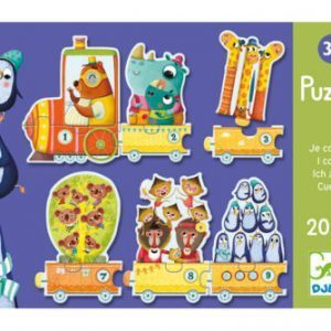 Rakd össze a vonatot és közben figyeld meg melyik kocsin hány állat utazik! A kedves állatok segítségével hoszzú vonatot kapsz! A játék 20 db keménykartonból készült elemből áll. A vonat teljes hossza 96 cm