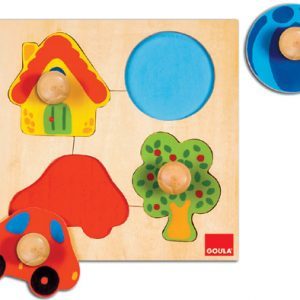 Ezek a fából készült fogantyús puzzle-k a legkisebbek kézügyességét, formafelismerését fejlesztik. Játék közben ismereteket gyűjtenek környezetükről. A színek és a formák egyeztetése az összefüggések felismeréséhez vezet. Egyéb fejlesztési terület: - színfelismerés fejlesztése 1 db. 22x22 cm, anyaga: fa