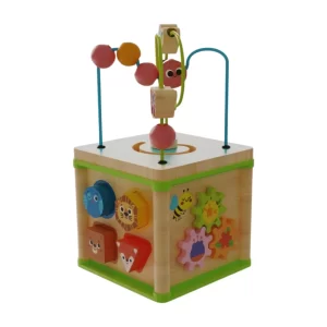 5 oldalú játékdoboz, amelynek mindegyik oldalán más és más típusú fejlesztő játék található. 1 db. 25x23x21 cm, anyaga: fa