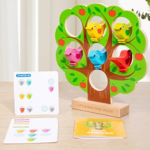 "A gyerek feladata, hogy a madarakat a mintakártyán látható sorrend és hely szerint helyezze be a fa megfelelő nyílásaiba. - Színfelismerés és formaazonosítás: A madarak színének megkülönböztetése és a kártyákon való követése. - Finommotorika és kézügyesség: A madarak pontos behelyezése...
