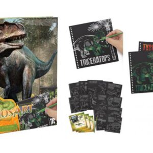 Tizennégy dinoszaurusz várja a felfedezést és a kreatív karcolást. A füzet 14 lappból áll amiken 14 különbüző dinó látható neveikkel. A füzethez tartozik még 2 db kaparó szerszám is.